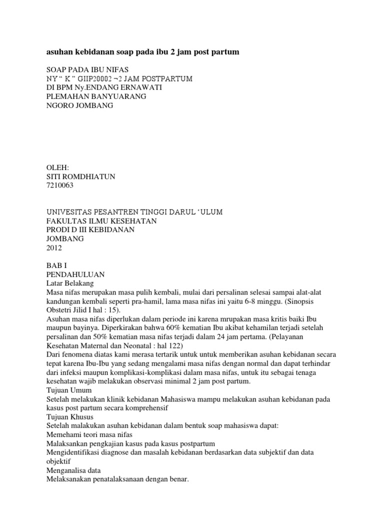 | Asuhan Kebidanan Soap Pada Ibu 2 Jam Post Partum Sumber: pt.scribd.com |