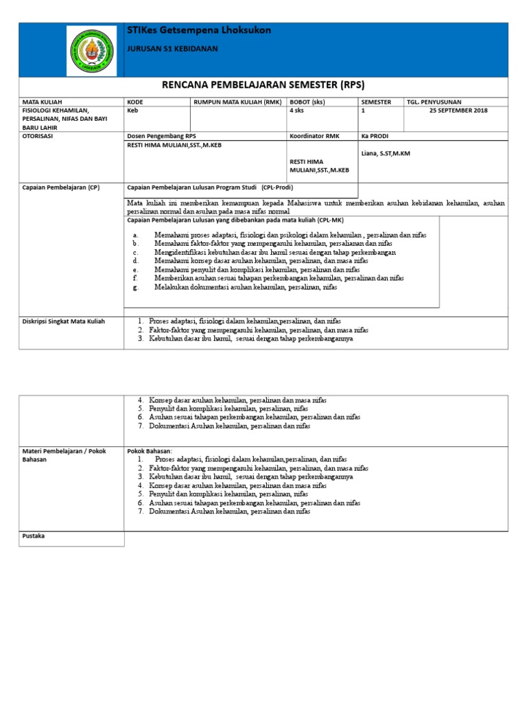 Materi pembelajaran askeb nifas. Silabus rps. Rps program studi.